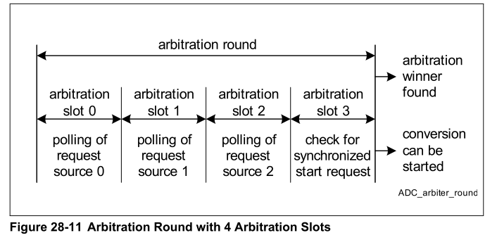 •最后一个仲裁槽:Synchronization source,来自另一个ADC内核的同步转换请求(总是在同步从内核中以最高优先级处理)