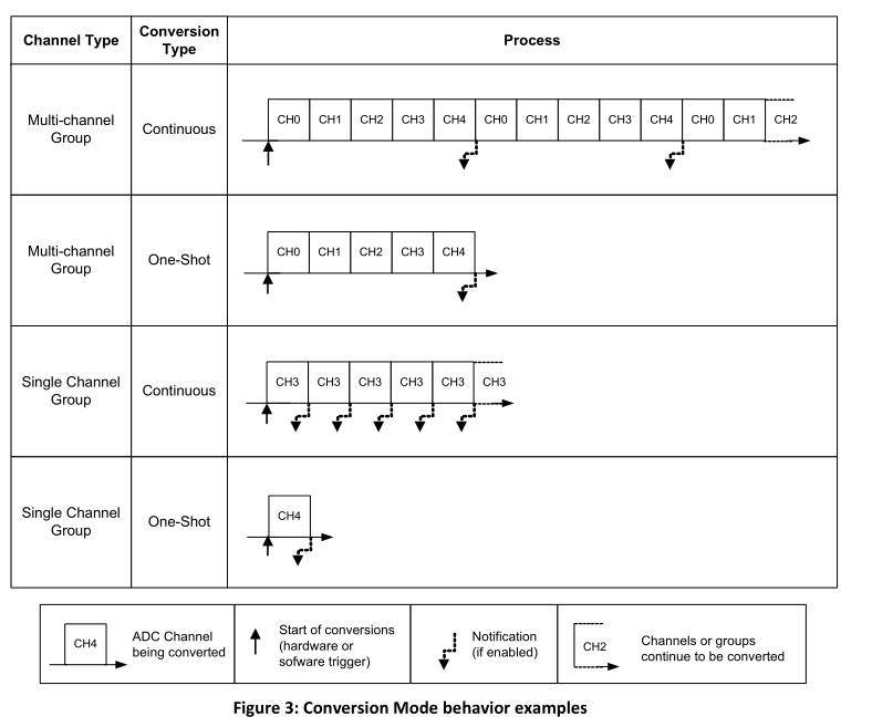 例1:连续转换模式配置了包含通道[CH0, CH1, CH2, CH3, CH4]的通道组。完成每次扫描后,调用notification(如果启用)。然后会自动启动新的扫描。
