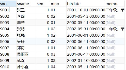 CREATE TABLE stu ( sno char(4) NOT NULL,sname nvarchar(8) NOT NULL,sex smallint DEFAULT NULL,mno char(2) DEFAULT NULL,birdate datetime DEFAULT NULL,memo ntext,PRIMARY KEY (sno)