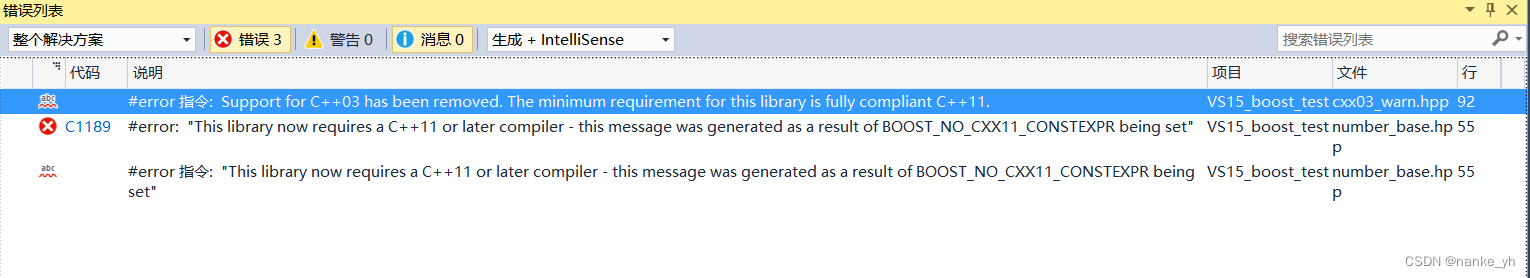 编译完boost静态库后,在vs2015上新建工程,并且引入boost库(boost库的调用步骤详见Windows下Boost库的安装与使用),然后写入测试案例,进行生成编译,却一直报如下的错误:
