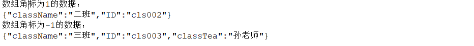 3.通过下标获取数组的指定数据 :$.grade.class[1],$.grade.class[-1],因为数组下标从0 开始,所以下标为1获取的是第二个数据,这里-0按照下标为0处理了,所以-1输出的是倒数第一个数据