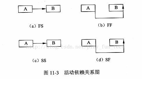 (3)依赖关系:完成对开始(FS)、完成对完成(FF)、开始对开始(SS)和开始对完成(SF)