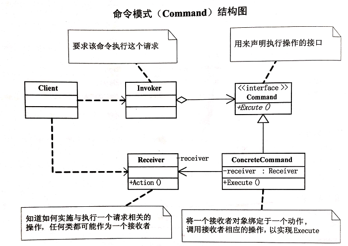 命令模式(Command),将一个请求封装为对象,从而使你看用不同的请求对客户端进行参数化;对请求排队或记录请求日志,以及支持可撤销操作。