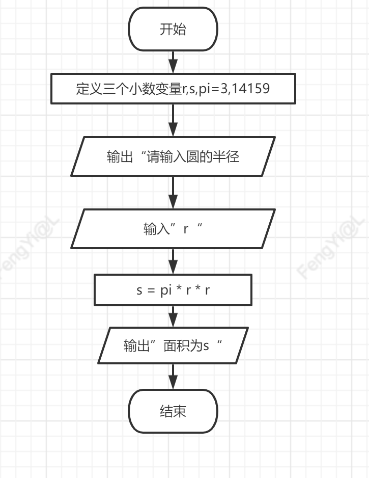 {double r, s, pi = 3.14159;printf("请输入圆的半径为:");scanf_s("%lf", &r);s = pi * r * r;printf("面积为:%f", s);return 0;