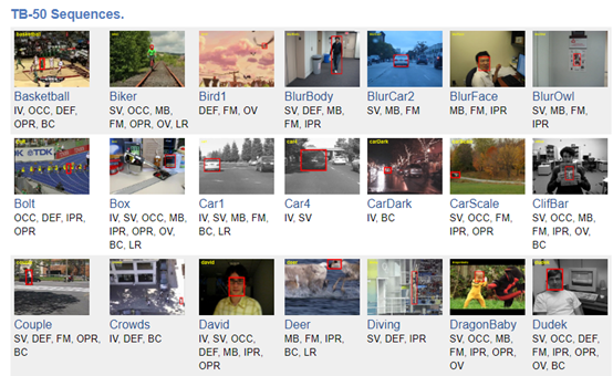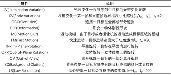 本文采用的测试集来自于在2013年CVPR中提出的视频跟踪基准库(Visual Tracker Benchmark)。该Visual Tracker Benchmark视频库中的TB-50包含了50个视频,其中视频的每一帧都人工标注了ground-truth。该视频库的每一段视频都有各个属性,比如光照变化,运动模糊,遮挡等属性,一共有十一个属性如表4-1所示。这些属性都考验着跟踪算法的性能。使用该数据库可以从各个特性方面有效的评估跟踪算法的性能。TB-50的部分视频信息如下图4.1所示。每一个视频片段包含视频名,该视频序列包含的属性。