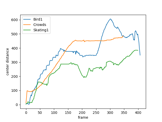 图(c),(d)对应的是Bird1,Crowds,skating1,横坐标是帧的序列,纵坐标分别是每一帧中meanshift检测出来的bbox与groundtruth的中心点坐标欧式距离与IOU值。从图(c)(d)中可以看出meanshift之所以效果这么差是因为在视频的前几帧meanshift就出现了跟丢目标的情况,然后就再也找不到正确的目标了,以至于IOU一直稳定在0,出现跟丢是因为目标出现了剧烈运动,光线出现距离变化,出现了很多与目标相似的目标等。