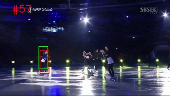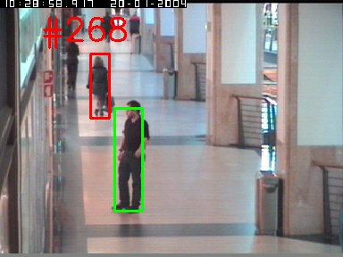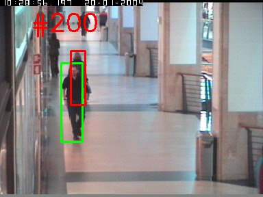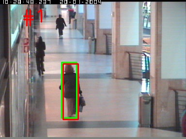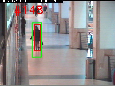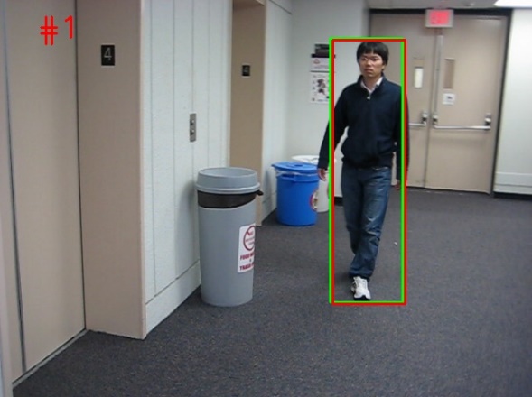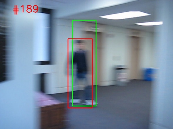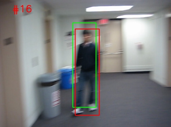 for dataset in tb50:result_path = 'result/{}/'.format(dataset)if not os.path.exists(result_path):os.makedirs(result_path)with open(os.path.join(root_path, dataset, 'groundtruth_rect.txt'), 'r') as f:gts = f.readlines()base_gt = gts[0].replace('\n', ' ')base_gt = base_gt.replace('\t', ' ')base_gt = re.sub(' +', ' ', base_gt)if ',' in base_gt:base_gt = base_gt.split(',')else:base_gt = base_gt.split(' ')x,y,w,h = int(base_gt[0]),int(base_gt[1]),int(base_gt[2]),int(base_gt[3])imgs_path = sorted(os.listdir(os.path.join(root_path, dataset, 'img')))frame = cv2.imread(os.path.join(root_path,dataset, 'img', imgs_path[0]))# roi = cv2.selectROI(windowName="roi", img=frame, showCrosshair=True, fromCenter=False)# x,y,w,h = roih_img, w_img, c = frame.shapetemp = frame[y:y+h, x:x+w]center_x = x+w/2center_y = y+h/2rect = [x,y,w,h]m_weight = np.zeros((h, w))hh = (w/2)*(w/2) + (h/2)*(h/2)for i in range(h):for j in range(w):dist = (i-h/2)*(i-h/2) + (j-w/2)*(j-w/2)m_weight[i][j] = 1-dist/hhC = 1/sum(sum(m_weight))hist1 = np.zeros((4096))for i in range(h):for j in range(w):q_r = math.floor(float(temp[i][j][0])/16)q_g = math.floor(float(temp[i][j][1])/16)q_b = math.floor(float(temp[i][j][2])/16)q_temp = q_r*256+q_g*16+q_bhist1[q_temp] = hist1[q_temp] + m_weight[i][j]hist1 = hist1*Crect[2] = math.ceil(rect[2])rect[3] = math.ceil(rect[3])q_temp1 = np.zeros((h,w))num_frame = 0center_list = []iou_list = []for path in imgs_path:base_gt = gts[num_frame].replace('\n', ' ')base_gt = base_gt.replace('\t', ' ')base_gt = re.sub(' +', ' ', base_gt)if ',' in base_gt:base_gt = base_gt.split(',')else:base_gt = base_gt.split(' ')frame = cv2.imread(os.path.join(root_path, dataset, 'img', path))num = 0Y = [2,2]num_frame += 1while (Y[0]*Y[0]+Y[1]*Y[1]) > 0.5 and num < 20:num += 1temp1 = frame[int(rect[1]):int(rect[1]+rect[3]), int(rect[0]):int(rect[0]+rect[2])]hist2 = np.zeros((4096))for i in range(h):for j in range(w):q_r = math.floor(float(temp1[i][j][0]) / 16)q_g = math.floor(float(temp1[i][j][1]) / 16)q_b = math.floor(float(temp1[i][j][2]) / 16)q_temp1[i][j] = q_r * 256 + q_g * 16 + q_bhist2[int(q_temp1[i][j])] = hist2[int(q_temp1[i][j])] + m_weight[i][j]hist2 = hist2*Cww = np.zeros((4096))for i in range(4096):if hist2[i] != 0:ww[i] = math.sqrt(hist1[i]/hist2[i])else:ww[i] = 0#尝试更新hist1# alpha = 0.998# hist1 = alpha*hist1+(1-alpha)*hist2sum_w = 0xw = np.array([0.0,0.0])for i in range(h):for j in range(w):sum_w += ww[int(q_temp1[i][j])]xw += ww[int(q_temp1[i][j])]*np.array([i-h/2-0.5, j-w/2-0.5])Y = xw/sum_wrect[0] = rect[0]+Y[1]rect[1] = rect[1]+Y[0]if rect[0] < 0:rect[0]= 0if rect[1] < 0:rect[1] = 0if (rect[0]+rect[2]) > w_img:rect[0] = rect[0]-((rect[0]+rect[2])-w_img)if (rect[1]+rect[3]) > h_img:rect[1] = rect[1]-((rect[1]+rect[3])-h_img)cv2.rectangle(frame, (int(rect[0]),int(rect[1])), (int(rect[0]+rect[2]), int(rect[1]+rect[3])), (0, 255, 0), 2)cv2.rectangle(frame, (int(base_gt[0]),int(base_gt[1])), (int(base_gt[0])+int(base_gt[2]), int(base_gt[1])+int(base_gt[3])), (0, 0, 255), 2)cv2.putText(frame, "#{}".format(num_frame), (45, 45), cv2.FONT_HERSHEY_SIMPLEX, 1.2, (0, 0, 255), 2)cv2.imwrite(result_path+'{:0>5d}.jpg'.format(num_frame), frame)boxA = [int(rect[0]),int(rect[1]), int(rect[0]+rect[2]), int(rect[1]+rect[3])]centerA = [int(int(rect[0])+int(rect[2])/2),int(int(rect[1])+int(rect[3])/2)]centerB = [int(int(base_gt[0])+int(base_gt[2])/2),int(int(base_gt[1])+int(base_gt[3])/2)]boxB = [int(base_gt[0]),int(base_gt[1]), int(base_gt[0])+int(base_gt[2]), int(base_gt[1])+int(base_gt[3])]center_list.append(center_dis(centerA, centerB))iou_list.append(axis_aligned_iou(boxA, boxB))# print(np.mean(np.array(center_list)))# print(np.mean(np.array(iou_list)))
