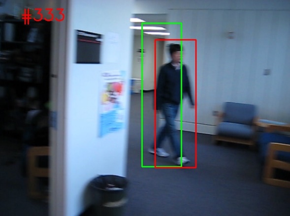 在图4.3中红色框表示groundtruth,绿色框表示meanshift跟踪出来的框,图片左上角表示当前第多少帧。从图中可以看出,当在第1帧与第16帧的时候,目标发生轻微的模糊与形变,meanshift都是可以较好的跟踪到目标的,但是在第189帧与第333帧,目标发现较大的形变以及模糊的时候就跟踪不到了。