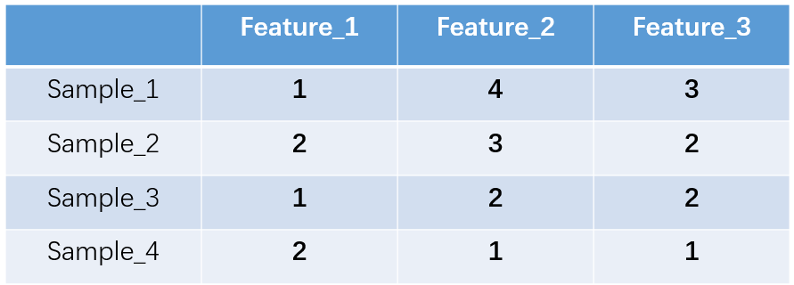 独热编码即 One-Hot 编码,又称一位有效编码,其方法是使用N位状态寄存器来对N个状态进行编码,每个状态都有它独立的寄存器位,并且在任意时候,其中只有一位有效。举个例子,假设我们有四个样本(行),每个样本有三个特征(列),如图: