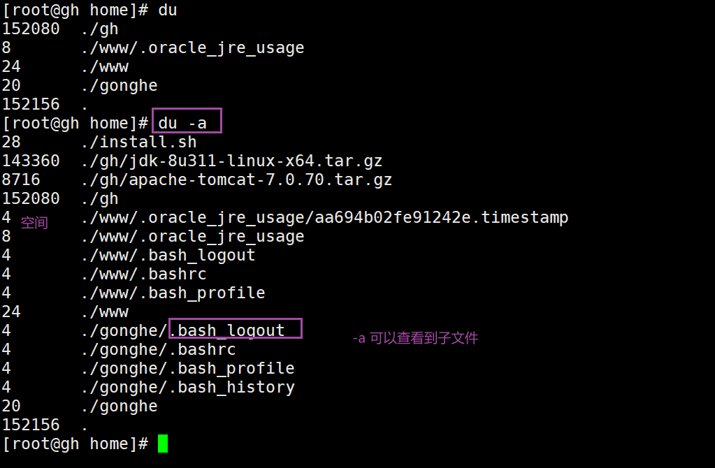 - -a :列出所有的文件与目录容量,因为默认仅统计目录底下的文件量而已。