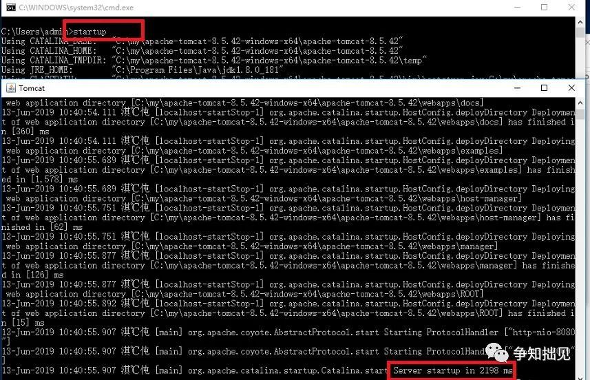 5、打开cmd命令提示符,输入startup后回车,就可以看到Tomcat成功启动了。