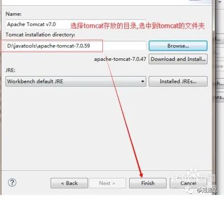6、选择Tomcat安装位置。选择完成后点击【finish】。
