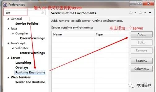 4、在打开的preferences窗口中,在顶部的输入框输入server,然后选择Runtime,点击右侧的【add】。