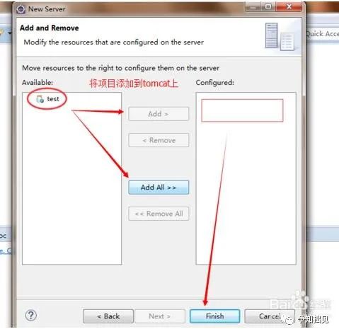 7、tomcat容器上添加删除web项目。在tomcat上右键“Add and Remove” 添加web项目,将项目选中到右侧。