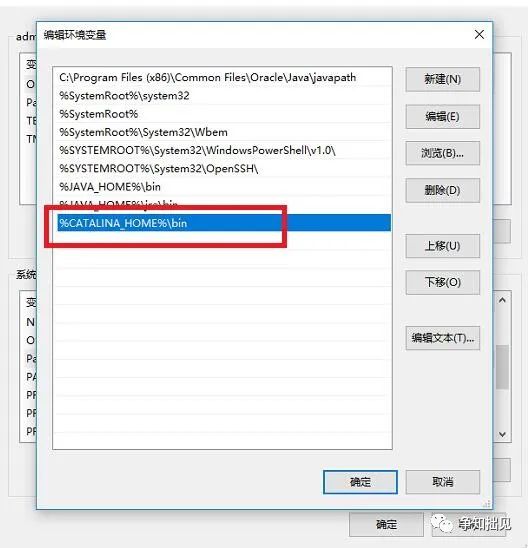 4、找到Path变量,点击编辑 变量名:Path 变量值:%CATALINA_HOME%bin。