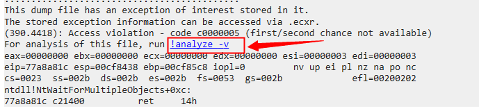 完成前面2步就可以开始调试崩溃信息,在打开dump文件时候,有一个提示,可以点击操作,命令(扩展命令)是!analyze -v 如下图