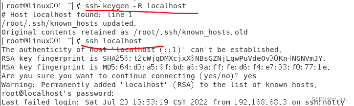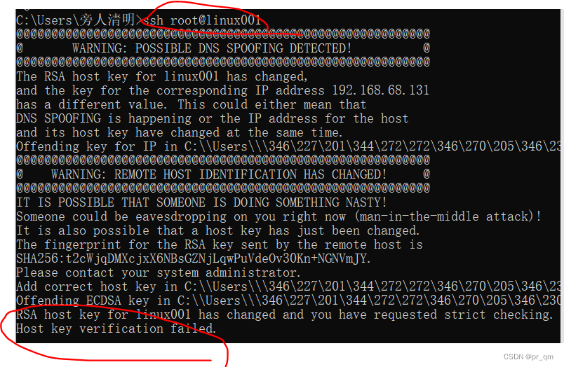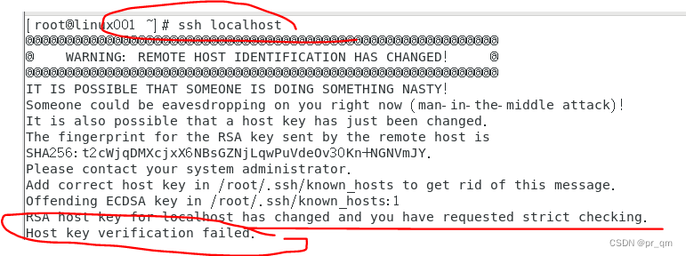4.RSA host key for linux001 has changed and you have requested strict checking.Host key verification failed.