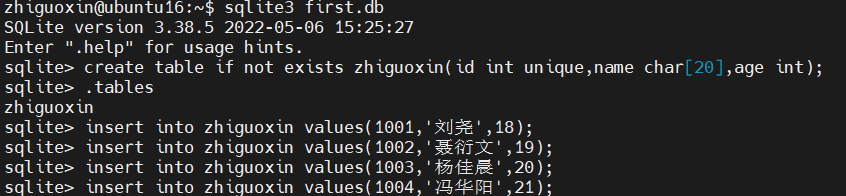 create table if not exists zhiguoxin(id int unique,name char[20],age int);