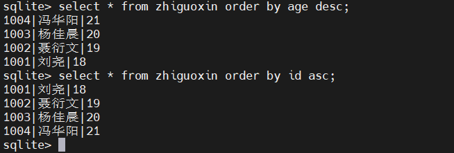 select * from zhiguoxin order by age desc;//按年龄降序排序