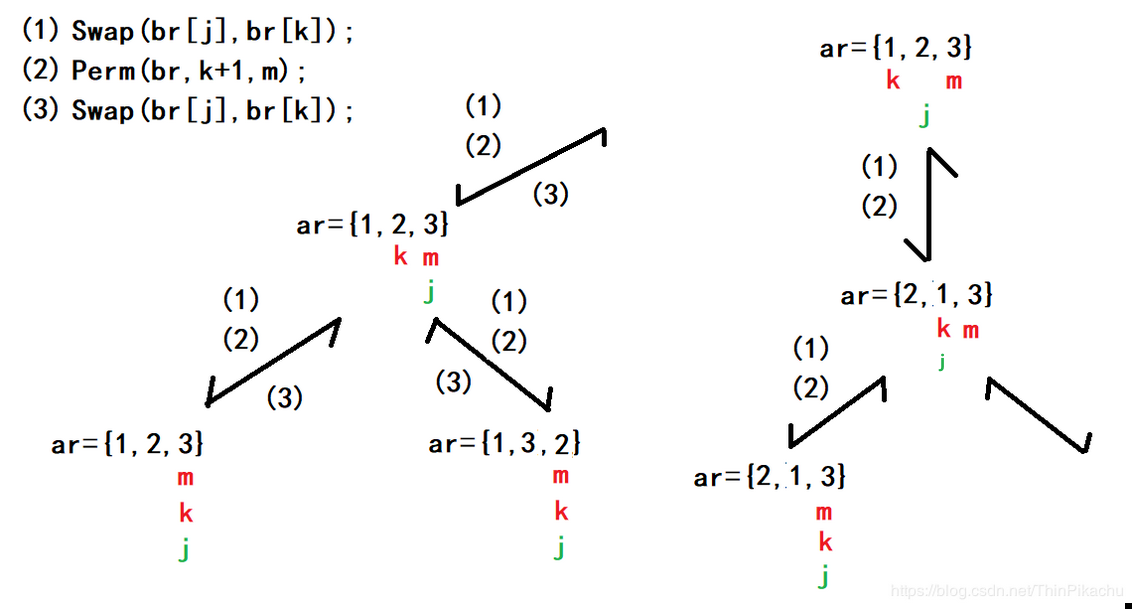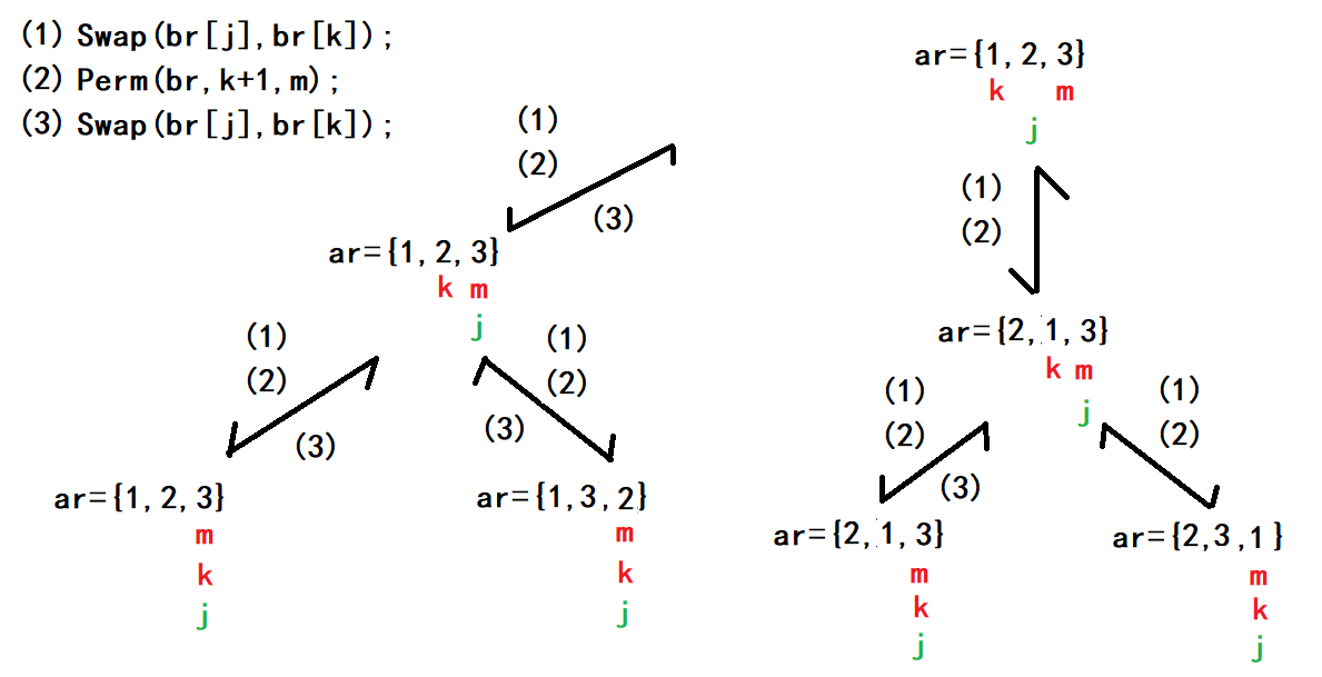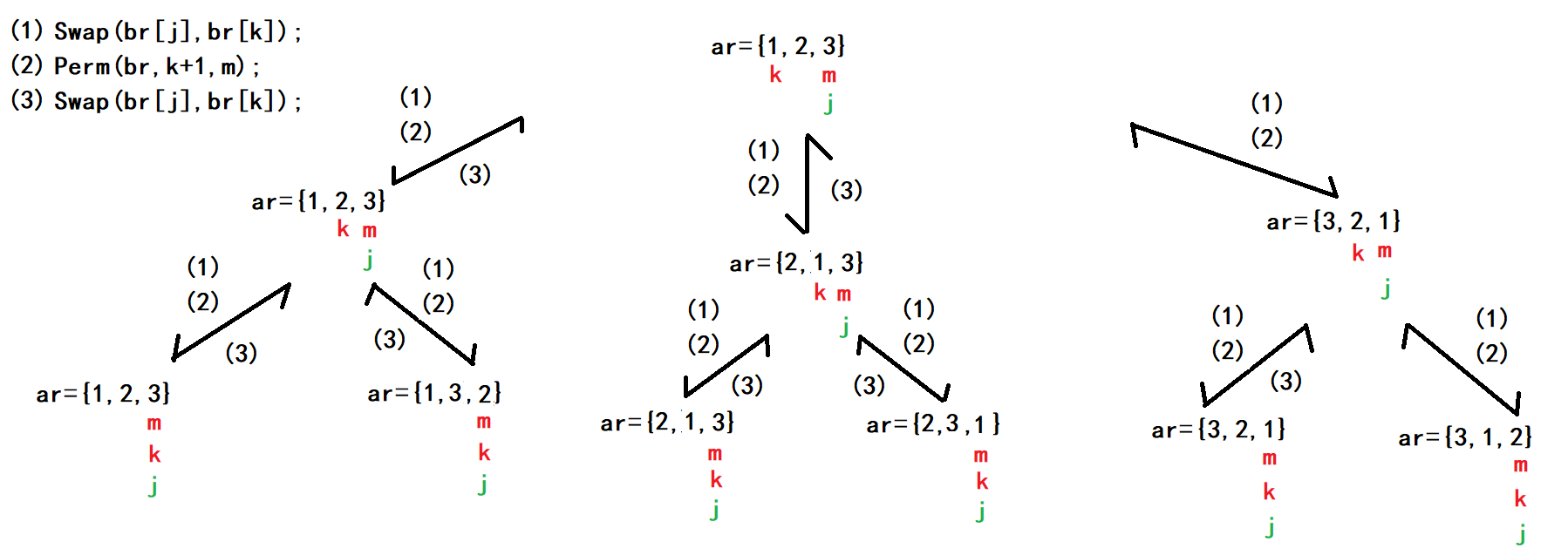 接着从 ar = {1,3,2} 这里开始执行(3),回到ar = {1,2,3}这里。此时 j == m,退出for循环,所以从 ar = {1,2,3} 这里继续执行(3),回退到第一个Perm函数中。