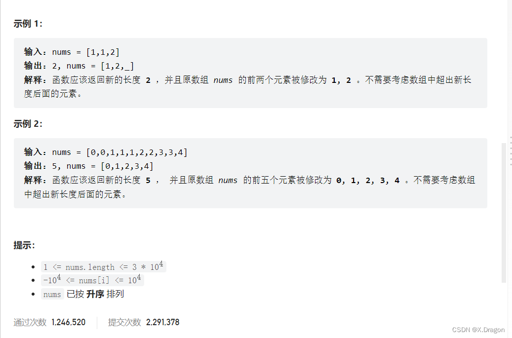 int removeDuplicates(int* nums, int numsSize){int src=1,dst=0;while(src<numsSize){if(nums[src]==nums[src-1]){src++;}else{nums[dst]=nums[src-1];src++;dst++;}}nums[dst]=nums[numsSize-1];dst++;return dst;}