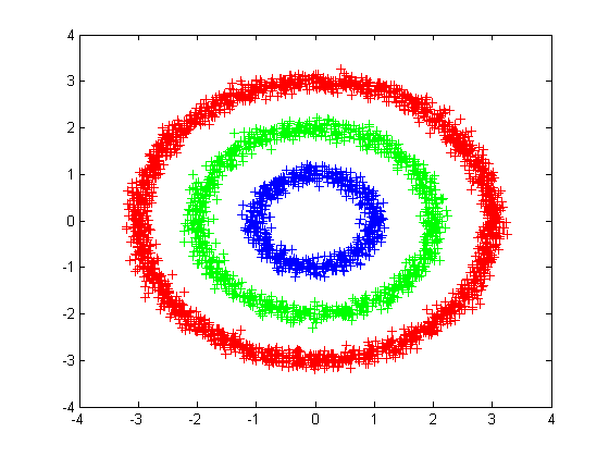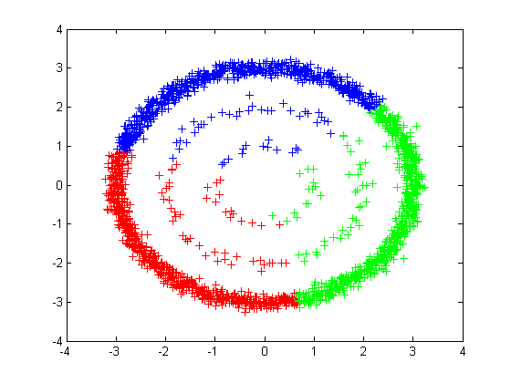 (4) 根据图最小分割的目标函数可知,谱聚类适用于均衡分类问题,即各簇之间点的个数相差不大,对于簇之间点个数相差悬殊的聚类问题,谱聚类则不适用。