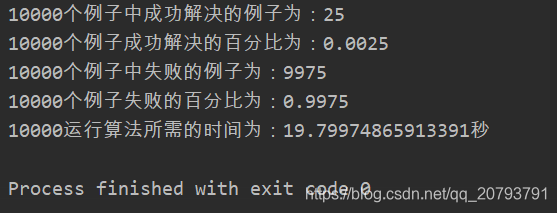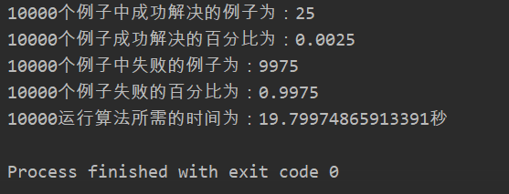 def climbing_algorithm():init_state, target_state = init()print("初始状态为:\n", init_state)print("目标状态为:\n", target_state)while True:current_manhattan_distance = compute_manhattan_distance(init_state, target_state) # 计算当前状态与目标状态的曼哈顿距离print("当前状态距离目标的曼哈顿距离为:", current_manhattan_distance)if current_manhattan_distance == 0: # 当前状态就是目标状态,算法结束return Truedistances = compute_manhattan_distance_all(init_state, target_state) # 计算空白方块所有可以移动的方向和对应的曼哈顿值print("distances:", distances)print("distances里面的最小值为:", minimal_manhattan_distance(distances))if current_manhattan_distance <= minimal_manhattan_distance(distances):return False # 即接下来无论如何移动的曼哈顿距离都大于目前的,则陷入了局部最优解init_state = next_move(init_state, distances)print("移动后的新状态为:\n", init_state)def climbing_algorithm_test(num):tic = time.time()success_case = 0fail_case = 0for i in range(num):print("第{0}个例子启动".format(i))if climbing_algorithm():success_case += 1print("第{0}个例子成功找到最优解".format(i))else:fail_case += 1print("第{0}个例子失败".format(i))toc = time.time()print("{0}个例子中成功解决的例子为:{1}".format(num, success_case))print("{0}个例子成功解决的百分比为:{1}".format(num, success_case / num))print("{0}个例子中失败的例子为:{1}".format(num, fail_case))print("{0}个例子失败的百分比为:{1}".format(num, fail_case / num))print("{0}运行算法所需的时间为:{1}秒".format(num, toc - tic))climbing_algorithm_test(10000)