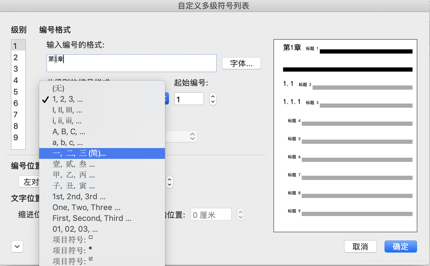 则需要将光标放在随意一个已定义标题上,选择定义新的多级列表,修改编号,在灰色标前后输入第和章,在下拉框中选择编号样式为需要的样式