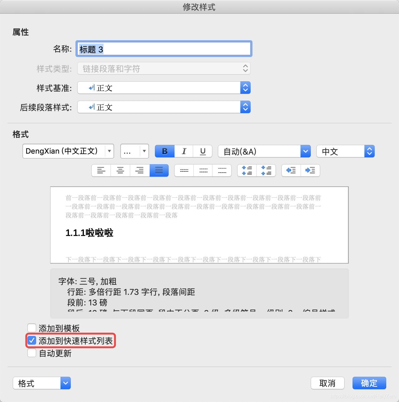 在所有样式中找到需要的 标题1 标题2 标题3,点击所需样式右侧下拉框,选择修改样式,在出现的面板中选择添加到快速样式列表就OK辽,之后就直接在工具栏点击进行使用就行了。