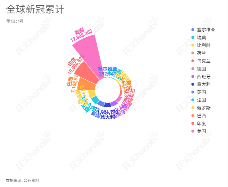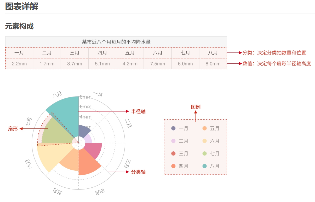 南丁格尔玫瑰图是用扇形的半径表示数据的大小,各扇形的角度则保持一致。可以说南丁格尔玫瑰图实际上是一种极坐标化的圆形直方图。它夸大了数据之间差异的视觉效果,适合展示数据原本差异小的数据