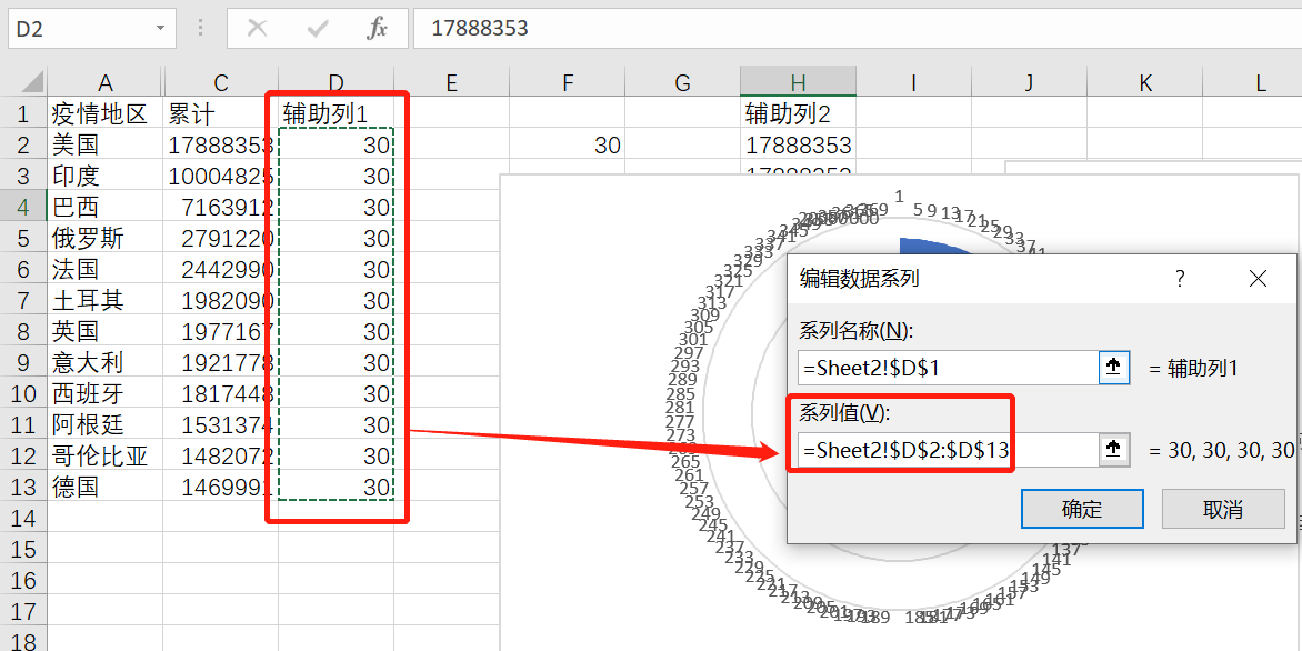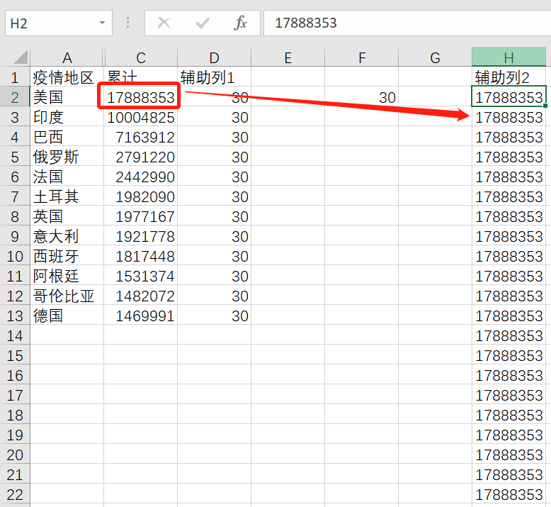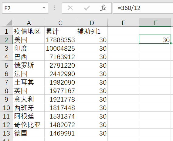每一个国家后的累计数据复制30次,均复制到辅助列2上,也就是说辅助列2应该有360条数据。