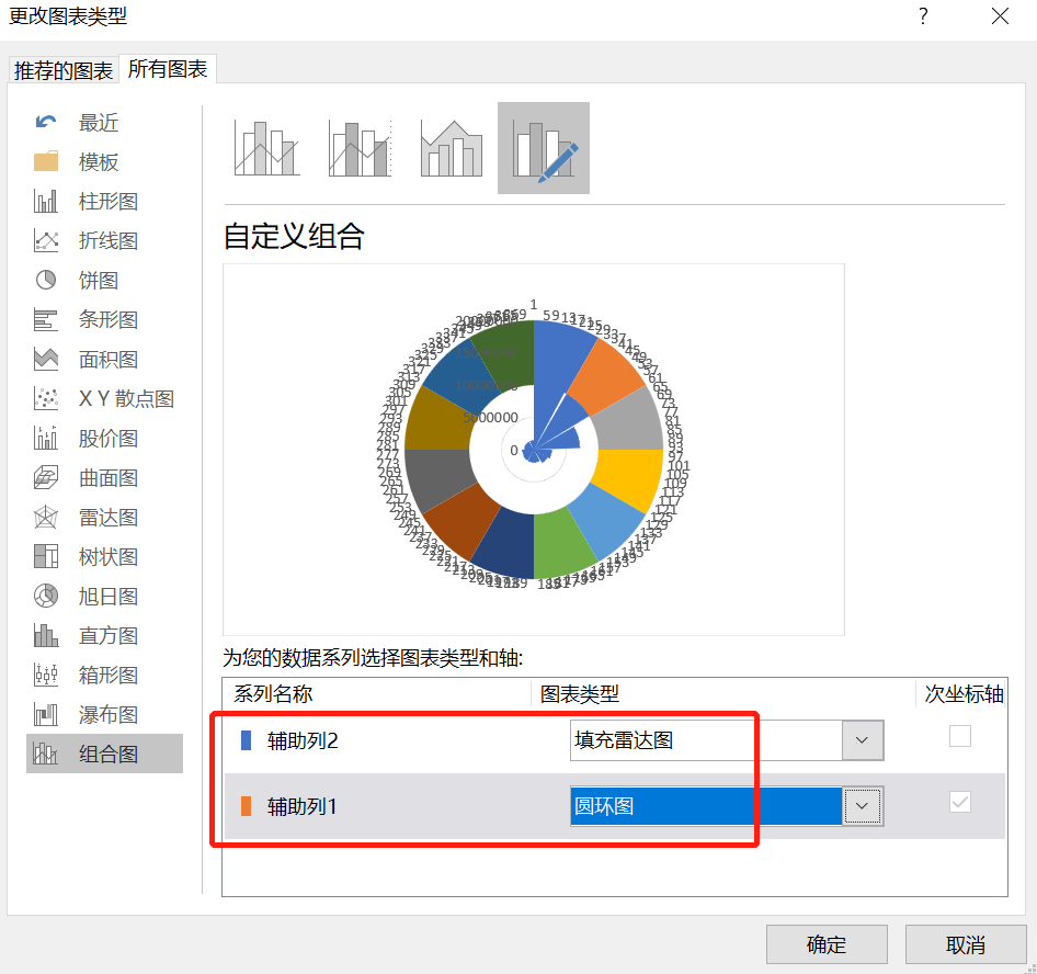 对其插入雷达面积图,同时将辅助列1添加进去。