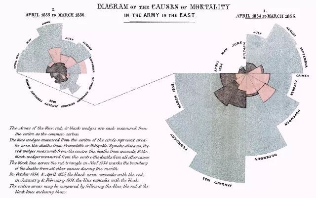 这张图就是南丁格尔当时报告这件事时所用的图表,以表达军医院季节性的死亡率,从整体上来看: 这张图是用来说明、比较战地医院伤患因各种原因死亡的人数,每块扇形代表着各个月份中的死亡人数,面积越大代表死亡人数越多。