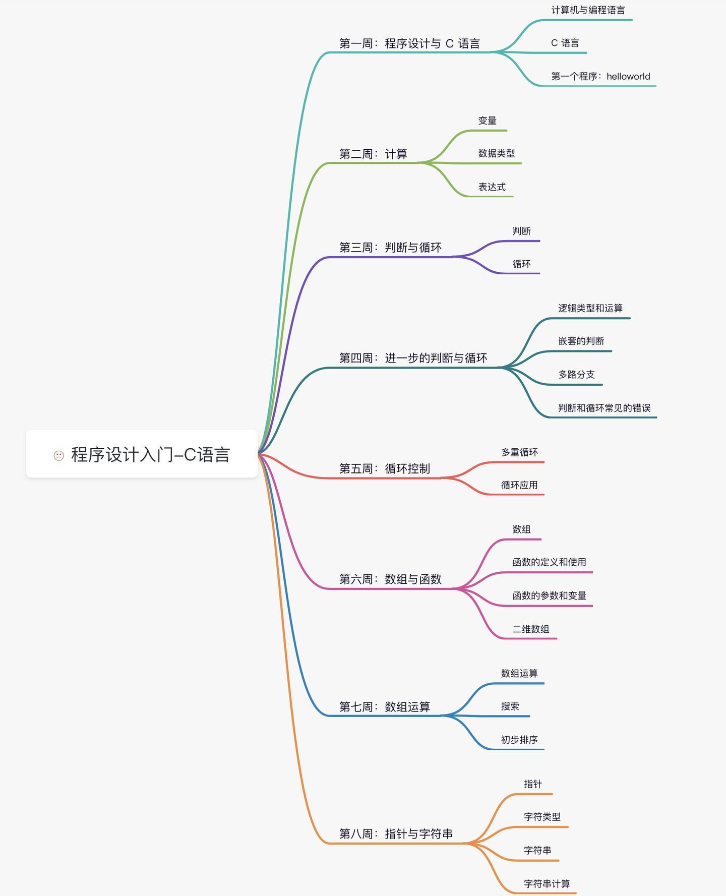 数据类型;运算符和表达式;输入和输出;流程控制;函数;数组;指针;结构体;文件操作;内存管理
