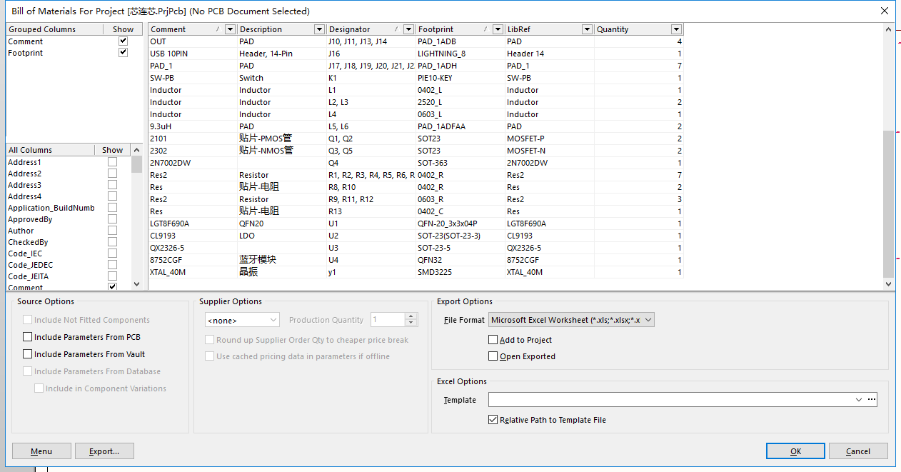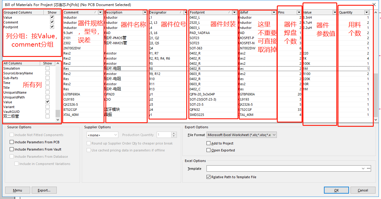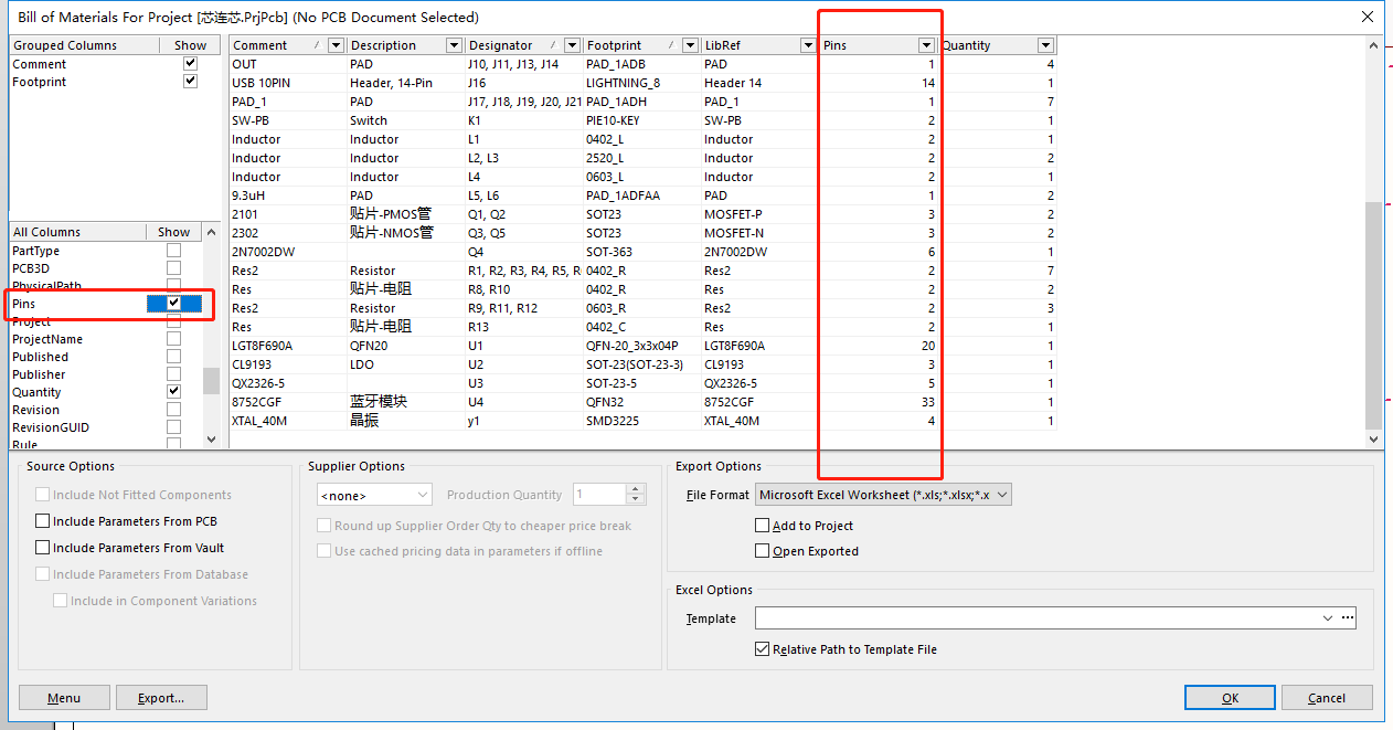 选择所需要的BOM表表头,BOM表头_comment_Description_designator_Footprint_Pins_Quantity_Value 。