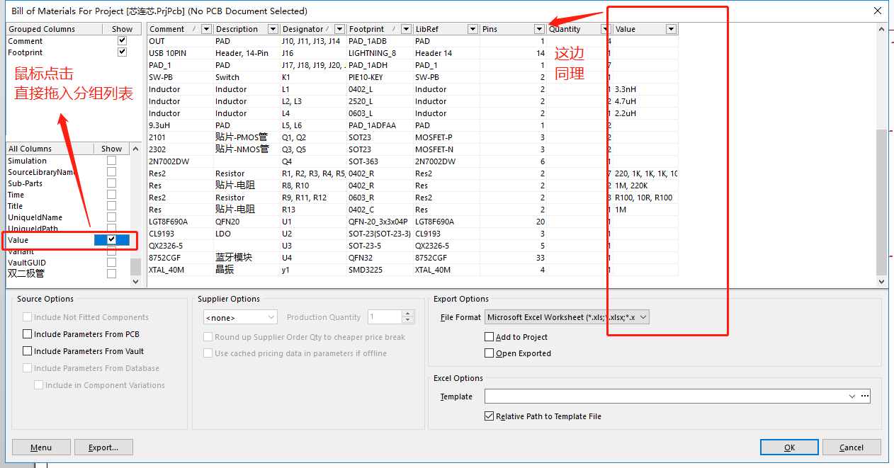 将Value放入Grouped columns(分组列表),按照某个参数分组,就是将表头Value中的值区分单独分成一行。 例如将12行R1,R2,R3,R4\220,1K,1K,1K,分成2行一行为R1\220,一行为R2,R3,R4\1K 。 11行2N7002DW,具体对比下面2个图。
