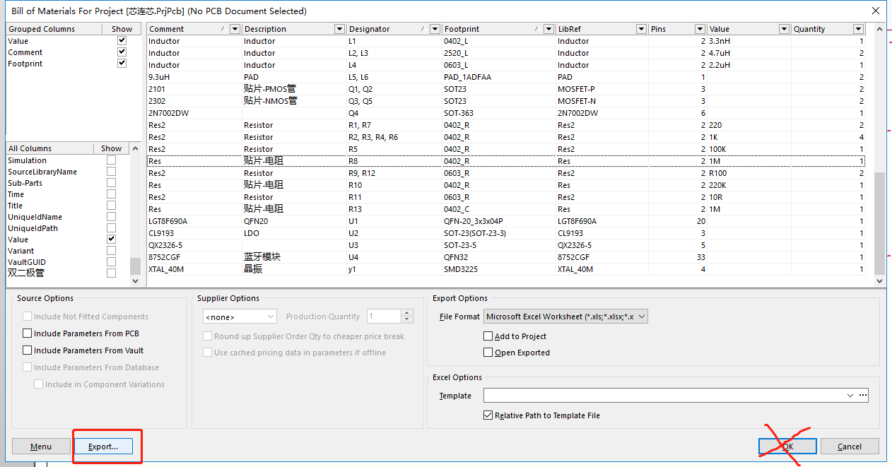 参数和表头设置好后,接着就是导出BOM表了,这里是选择下面的Export(导出)按钮,而不是选择OK按钮。