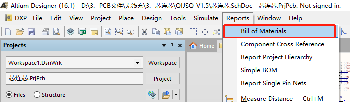 打开Altium Designer软件,然后在原理图界面(XXX.SchDoc),选择 Reports(报告)>> Bill of Materials(材料清单)。