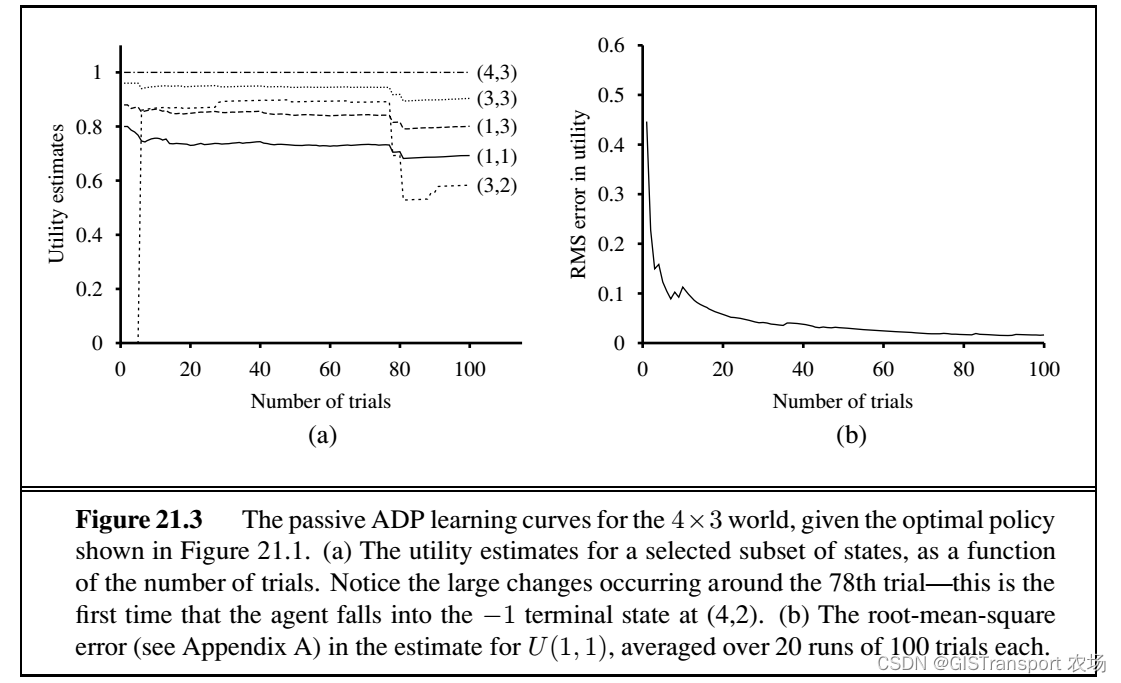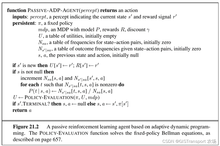 Adaptive dynamic programming (or ADP) agent 利用states 效用之间的限制关系学习的状态转移模型,并通过动态规划的方式来求解对应MDP问题。对于一个passive learning问题,这意味通过将学习得到的