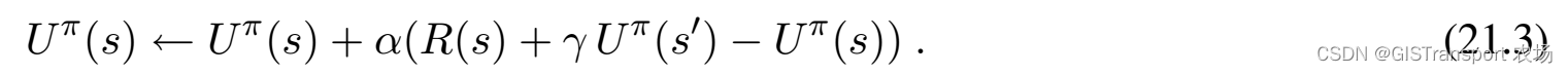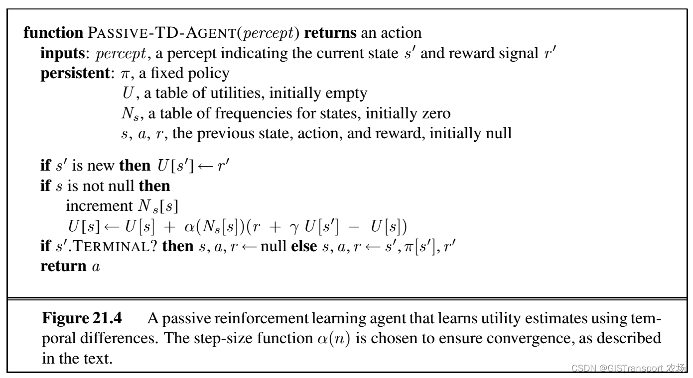 称之为学习率,由于计算中存在两个相邻状态效用的差值,因此被称之为temporal-difference。和公式21.2相比,这里我们仅仅只考虑了实际观测到的下一个状态 s' ,并没有考虑其对应的转换概率。这里可能大家会疑惑如果 s' 对应的是一个小概率事件,那么对