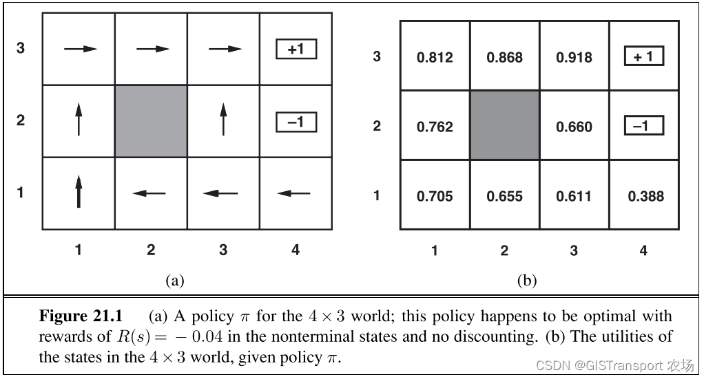 和观测得到的R (s),代入到公式21.2中来计算得到states的效用。正如我们在马尔科夫决策过程原理和求解讲解的,对于固定的policy,states的utilities 可以进行线性求解,也可以使用modified policy iteration 进行求解。