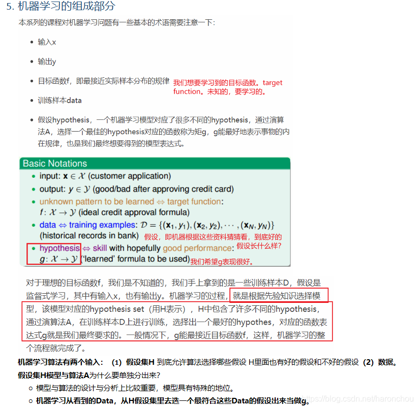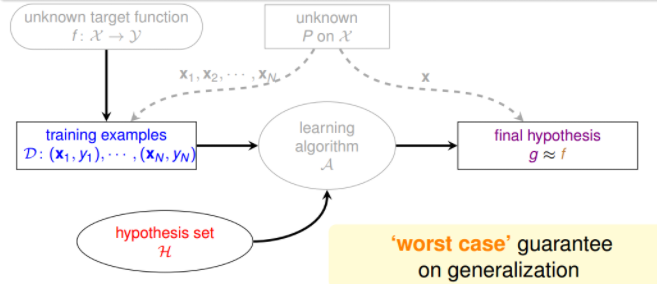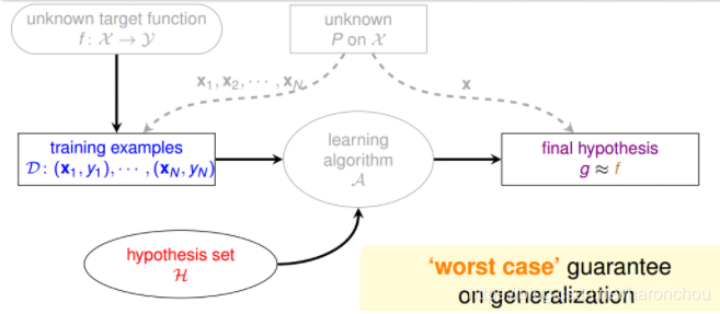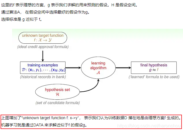 机器学习两个输入:从理想目标函数f产生的训练数据D,假设集H。然后学习算法A在H中选择一个最好的g,g是近似于f的。