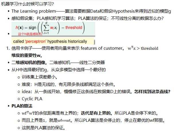1. 感知机假设集:x features,w权重。h(x)=sign(wx),线性分类器