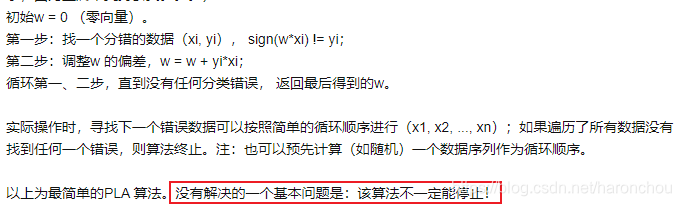 2. PLA算法:初始化w=0→找到一个分错的数据→调整w的权重:w=w+yi*xi→循环前两步,直到没有任何分类错误,迭代停止。