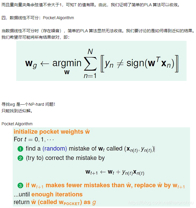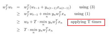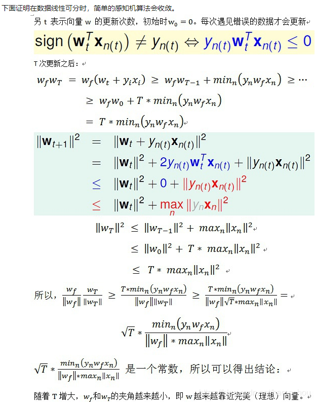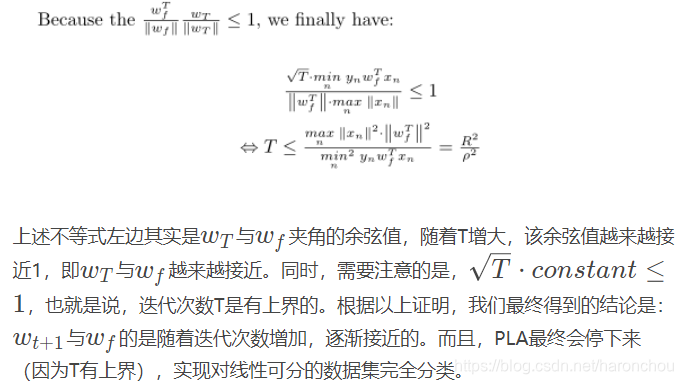 (1)线性可分时:评价指标 内积 越大,wf和wt越接近。同时还要去除|wf|和|wt|的影响。发现其下限与迭代次数T有关,且有上限。所以随着迭代次数T的增大,内积越来越接近上限。即越来越达到收敛。所以PLA是可以迭代停止的