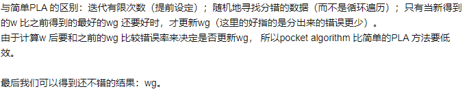 迭代次数有限(提前设定);随机寻找分错的数据(而不是遍历循环);只有新得到的w比之前的wg要好,才更新权重。