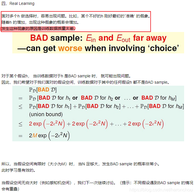 所以,当假设空间有限时(大小为M)时, 当N 足够大,发生BAD sample 的概率非常小。此时学习是有效的。