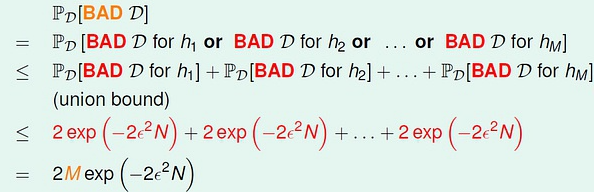 根据下面的公式:当M有限,N足够大时。我们能确保Bad Data的概率较小。Bad Data的概率PD(BAD D)一定要小。就需要控制M和N。