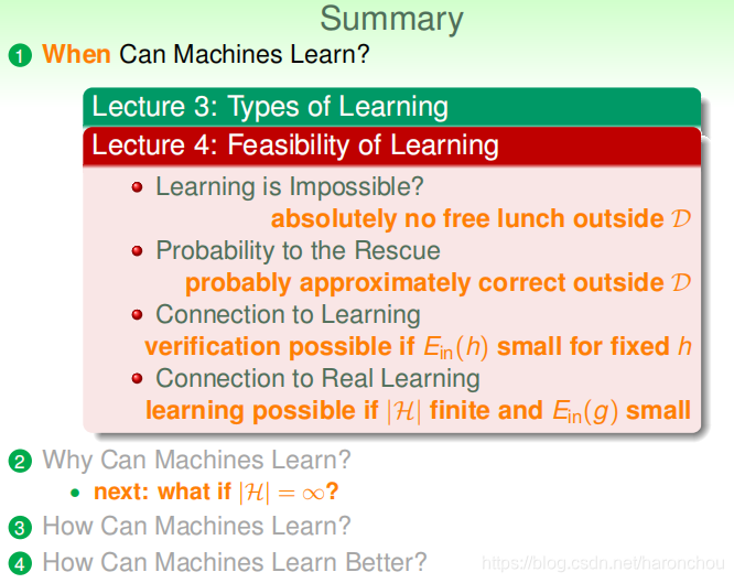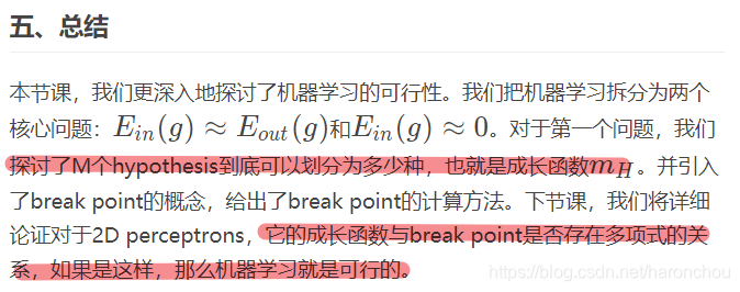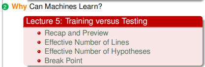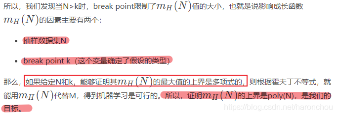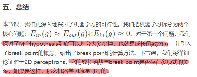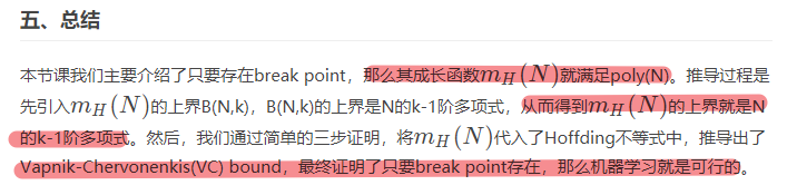 4. 只要Break Point存在(mH(H)的上限是k的多项式,所以M是有限的,N是足够大的),机器学习就是可行的。