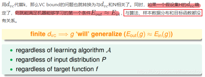 4. 一个假设集的dvc VC维确定了,就能满足机器学习的第一个条件 Eout=Ein,与算法、样本数据分布和目标函数都没有关系